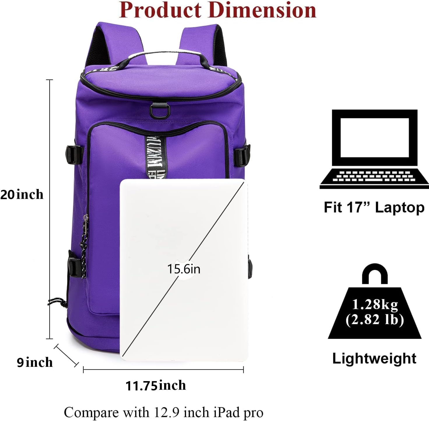 Including 1 front pocket / 1 large compartment pocket / 1 left pocket (water bottle or umbrella) / 1 right pocket (for wet towel) / 1 shoe pocket compartment, where the large one contains 1 mesh compartment pocket, 1 laptop shock-absorbing compartment,, 2 zipper pockets, 2 for iPhone, iPad, stationery, wallets, clothing slots, rechargeable batteries, etc.